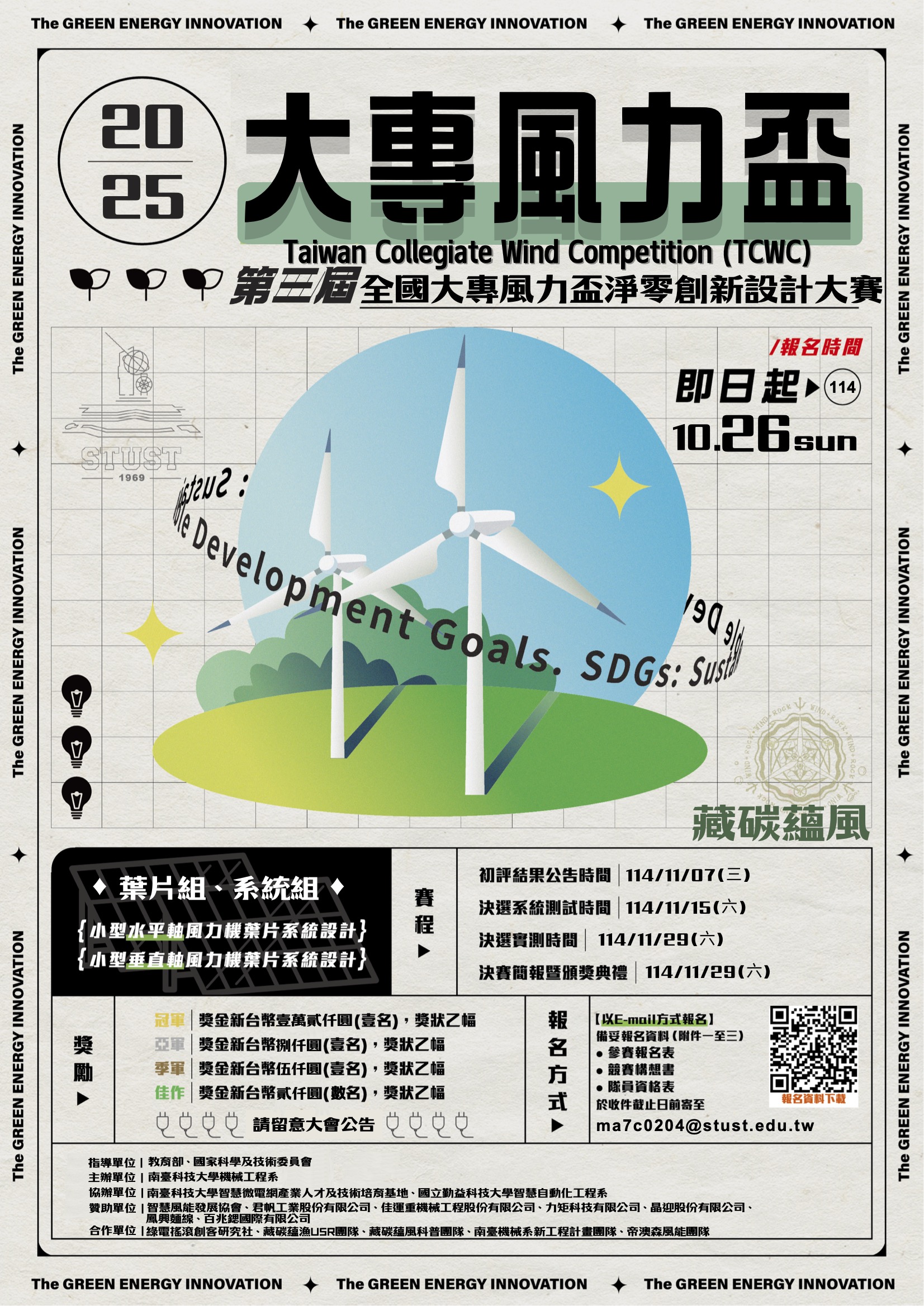 主旨:本校機械工程系舉辦「2025第三屆全國大專風力盃淨零創新設計大賽Taiwan Collegiate Wind Competition (TCWC)」(原:第三屆南臺風力盃-綠電創能創意淨零實作競賽),報名日期至114年10月26日,敬請公告周知並鼓勵貴校學生踴躍報名參加,請查照。